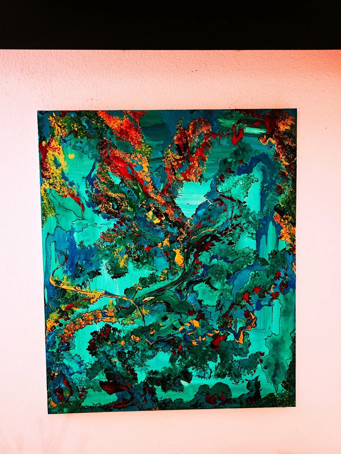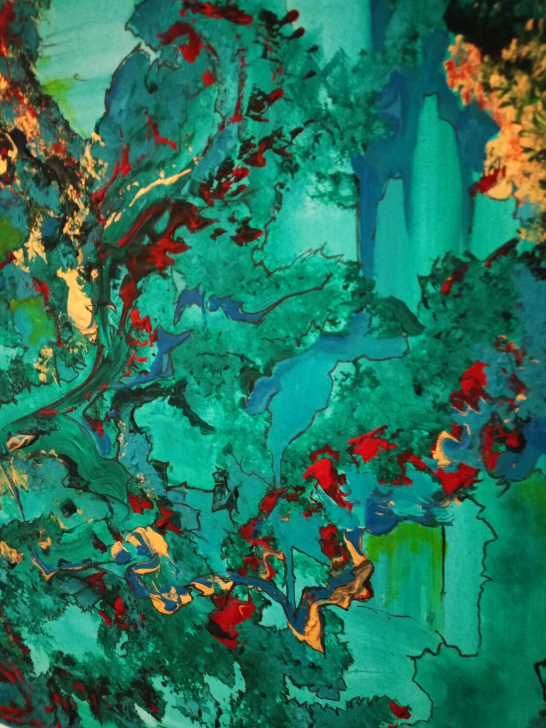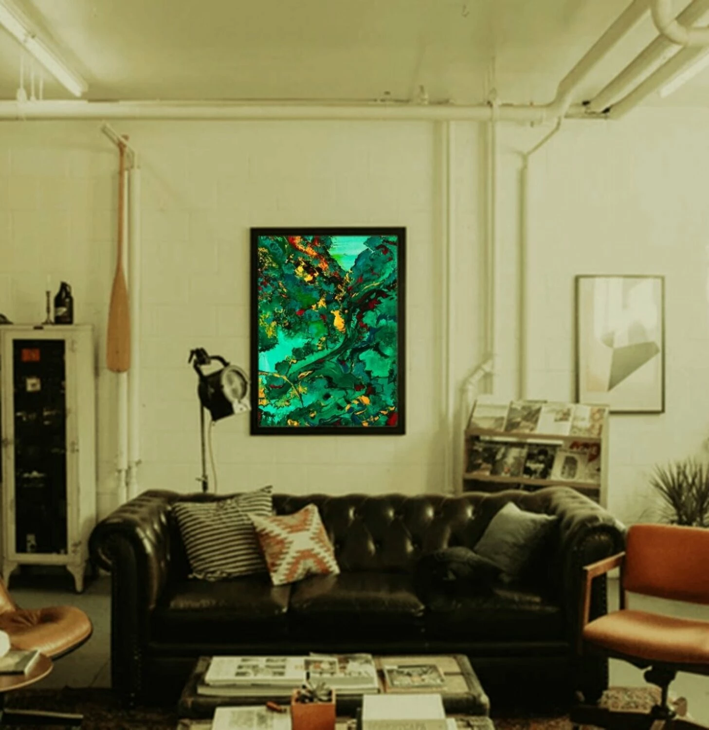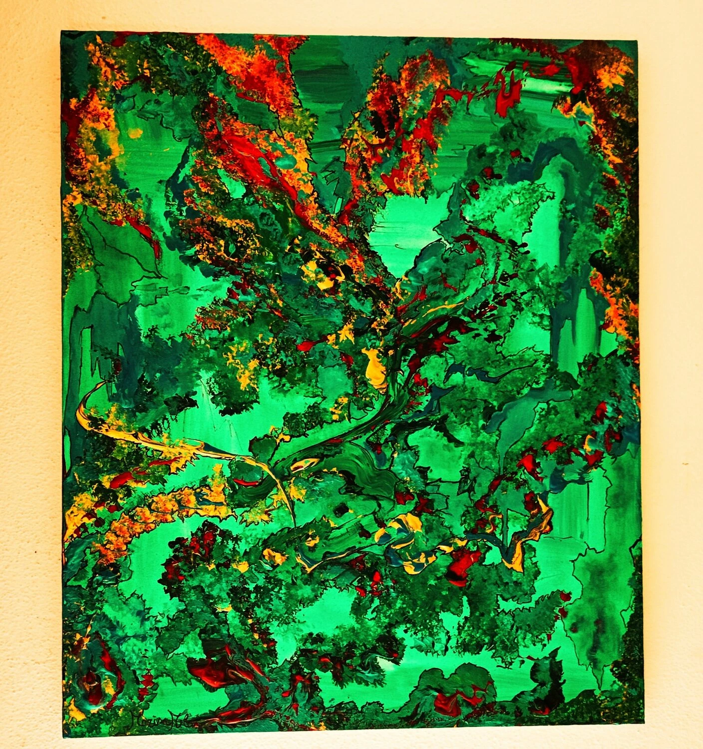 In questo dipinto ho voluto catturare l’energia nascosta della natura, un equilibrio fragile tra caos e armonia. I verdi profondi mescolati all’inchiostro indiano creano un gioco metafisico di movimento e silenzio. Ogni tratto esprime il tumulto interiore e la serenità, portando nelle vostre case una forza vitale che invita alla riflessione e al risveglio emotivo.