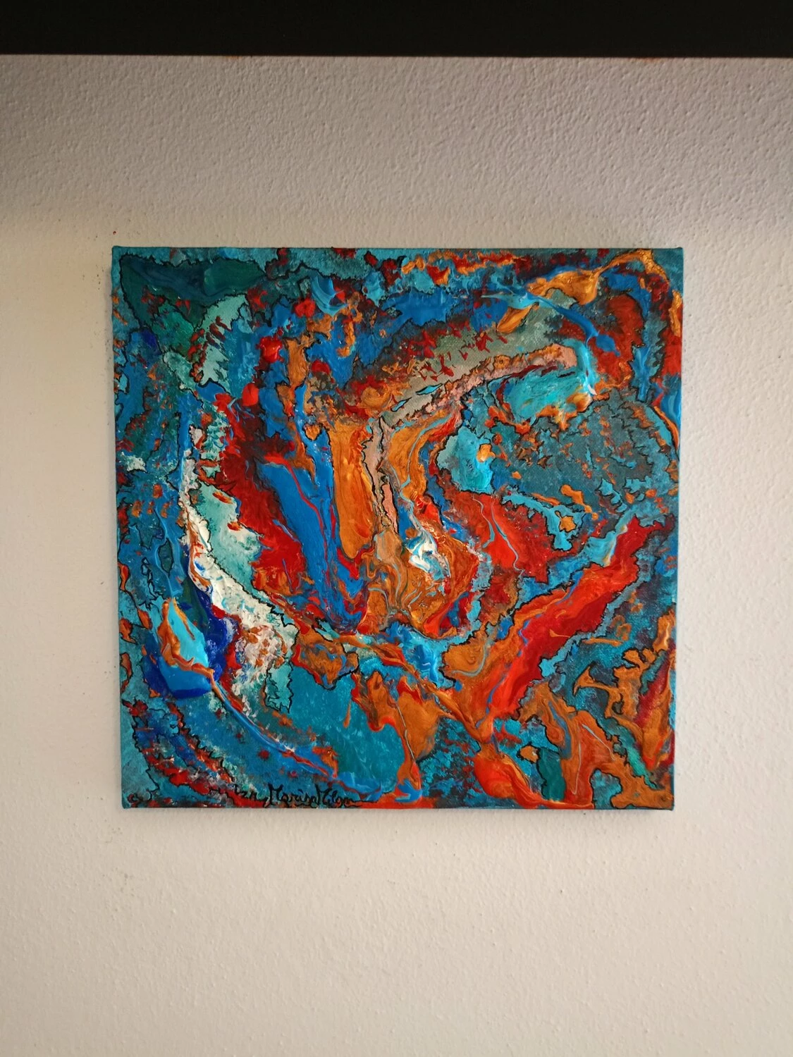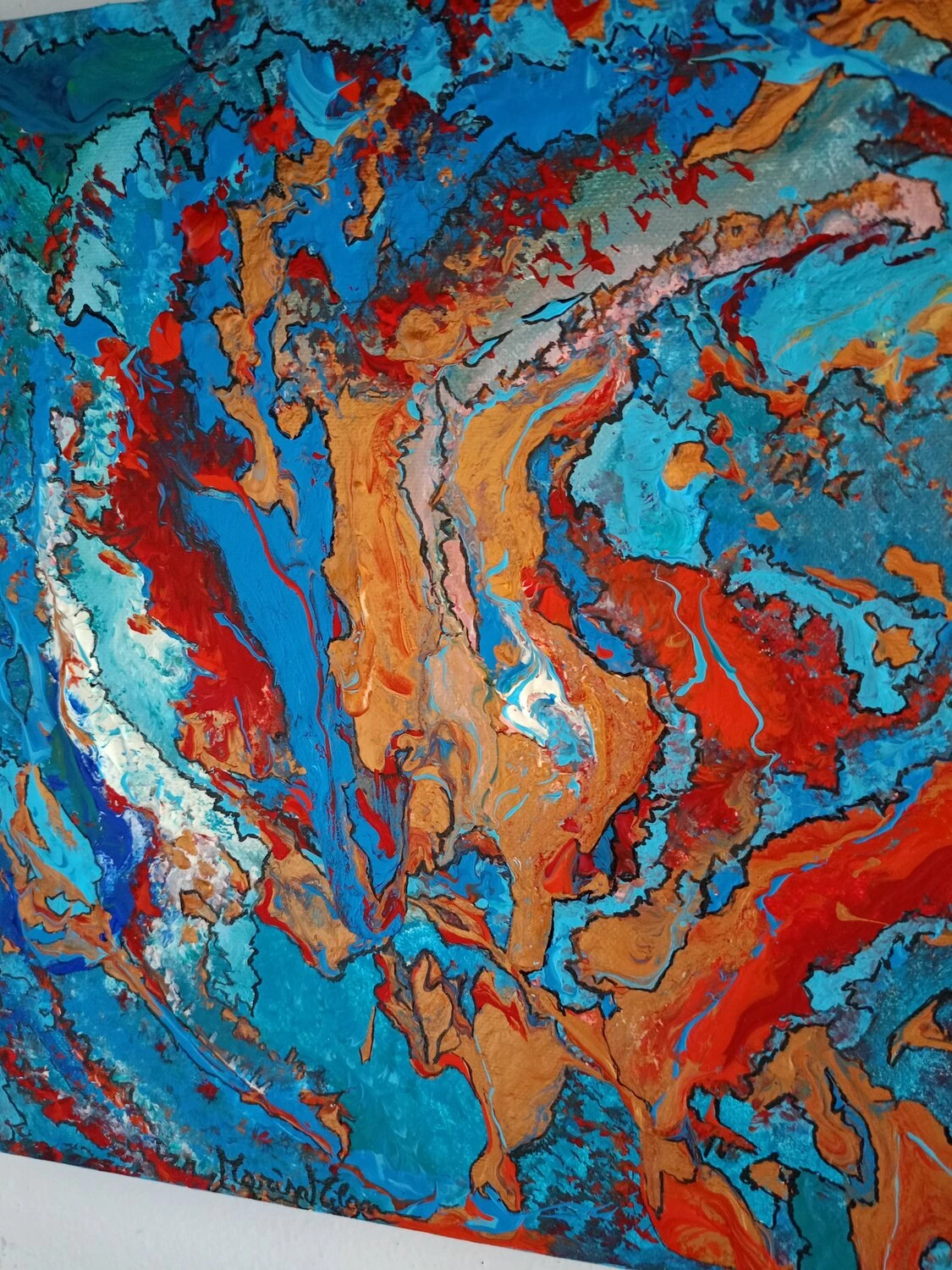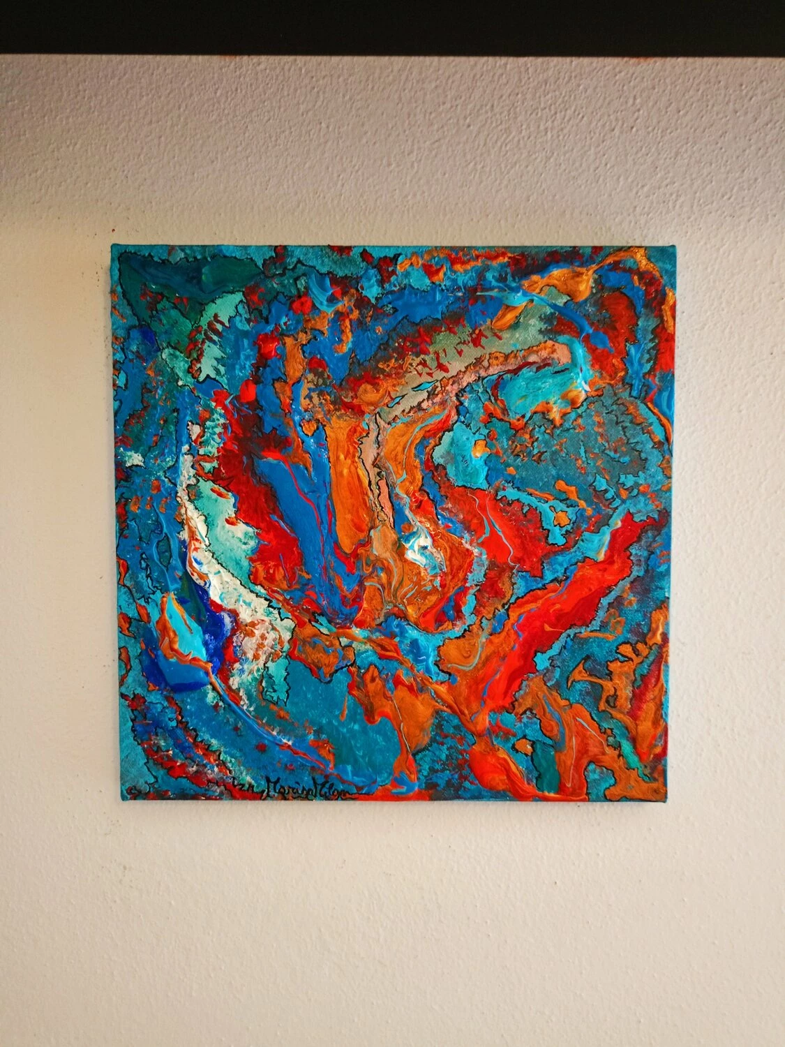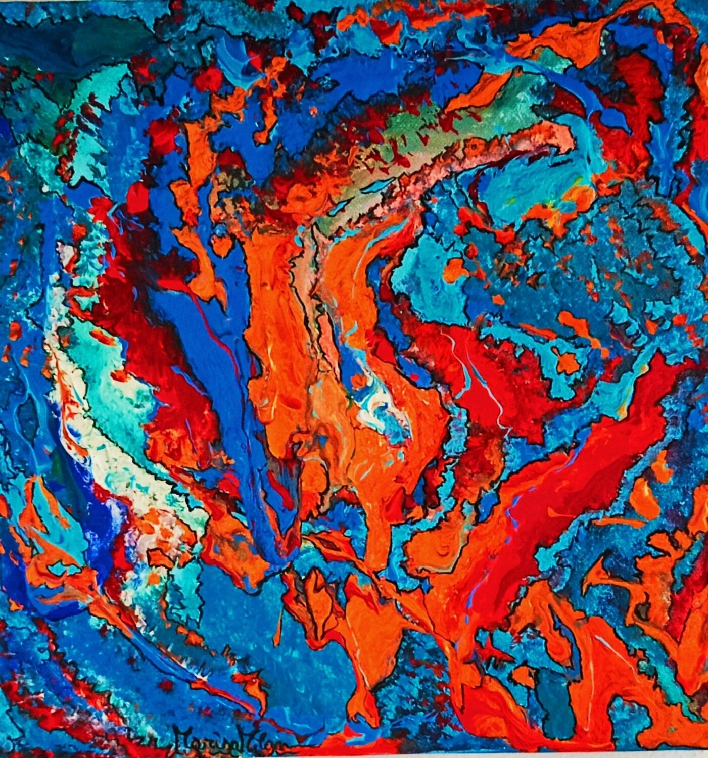 In quest’opera, ho voluto catturare l’impeto e la fluidità delle emozioni pure. L’uso vibrante di colori come il blu profondo e il rosso ardente rappresenta un viaggio attraverso le passioni infuocate e i profondi abissi della mente umana. Estruso in acrilico con tocchi di inchiostro d’India, questa tela parla di trasformazione e di scoperte interiori che invitano alla riflessione. Portando questa opera nella tua casa, aggiungerai non solo un tocco di colore, ma anche un flusso continuo di ispirazione e energia.