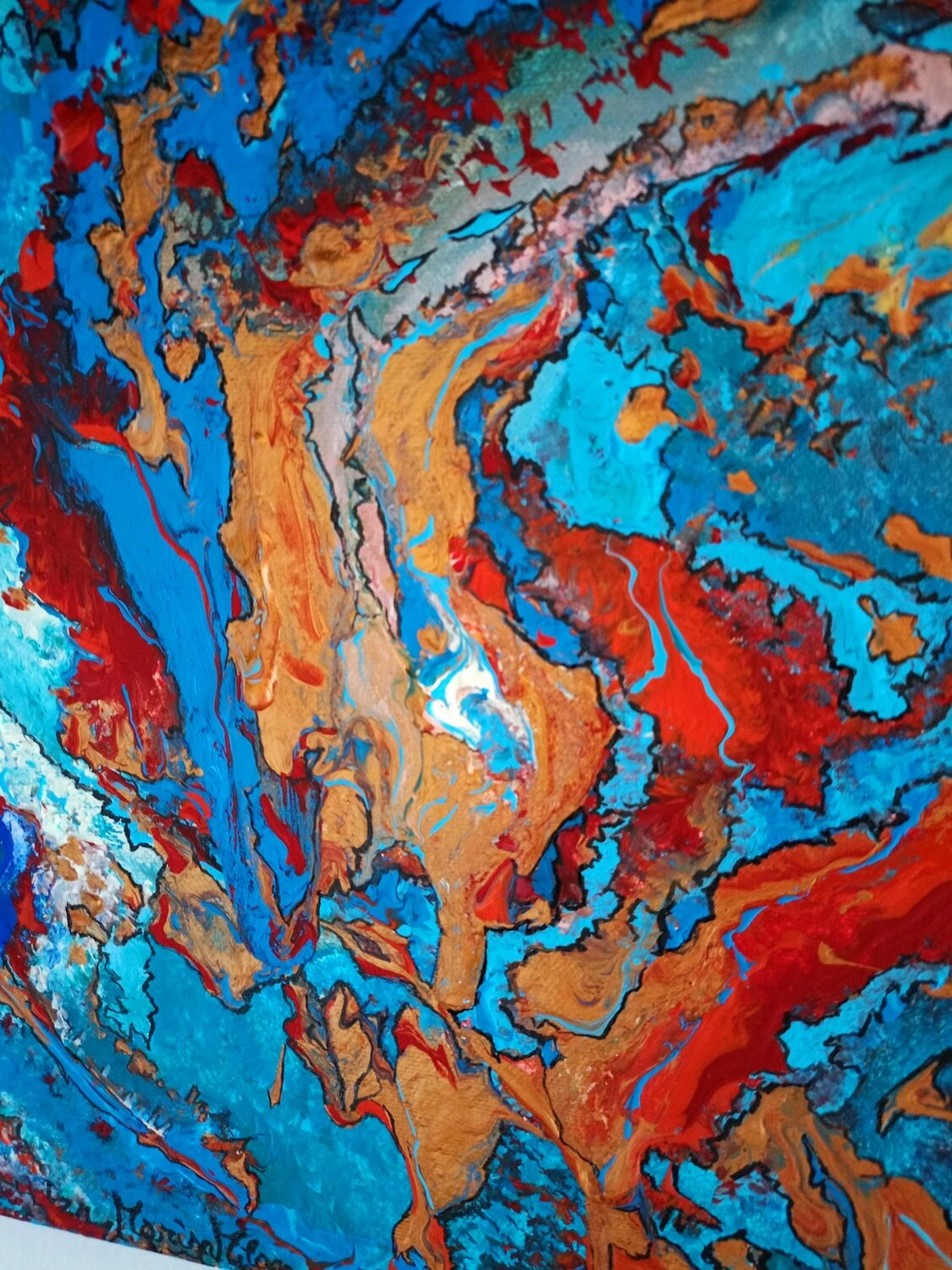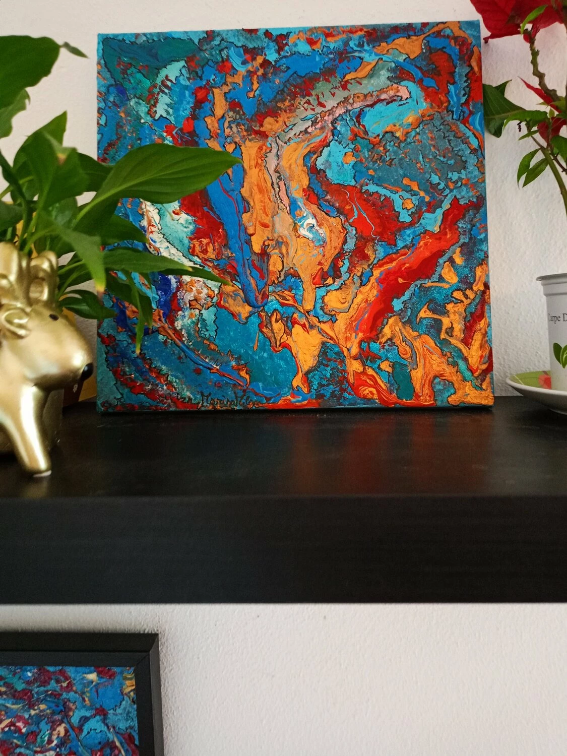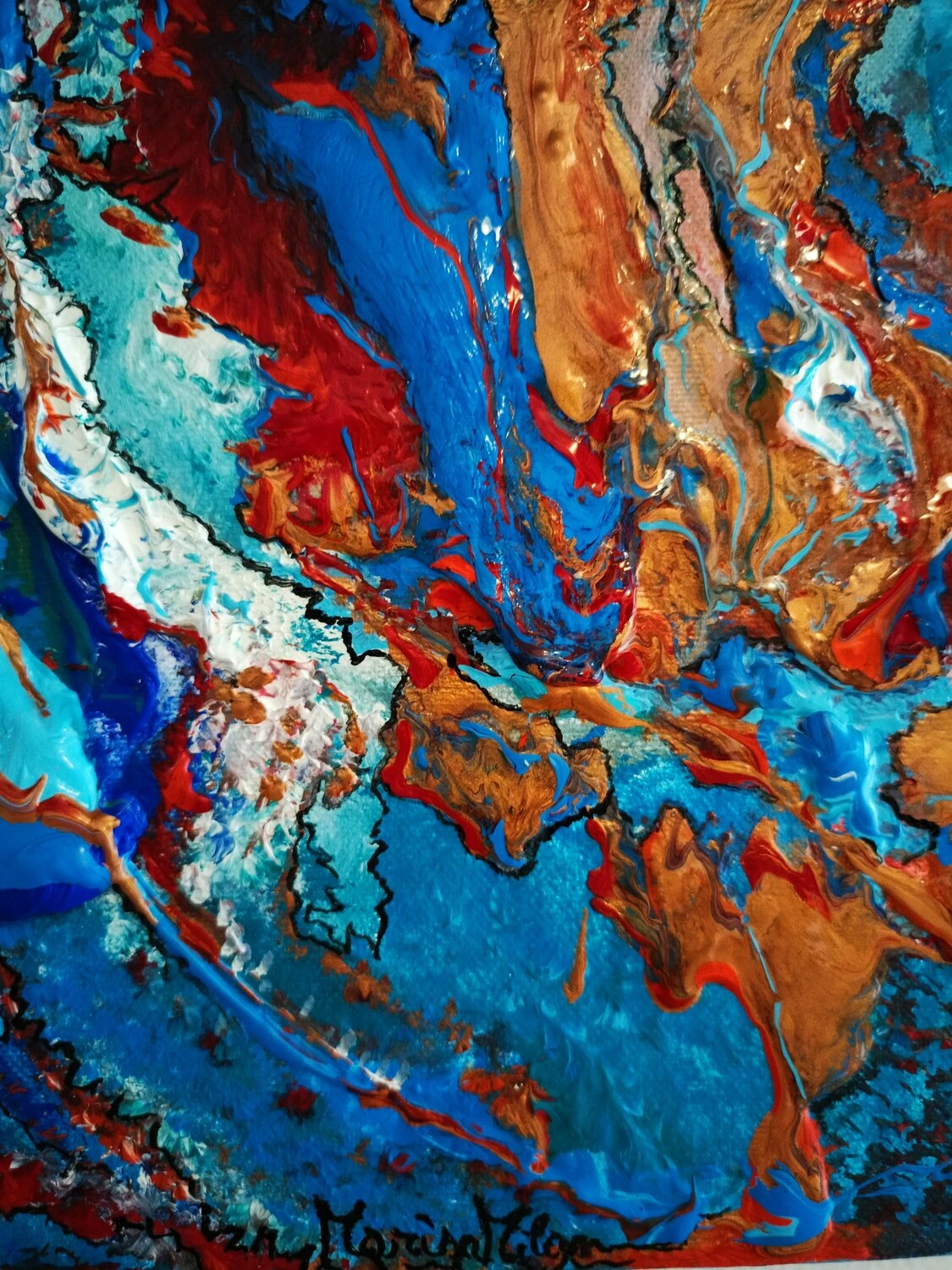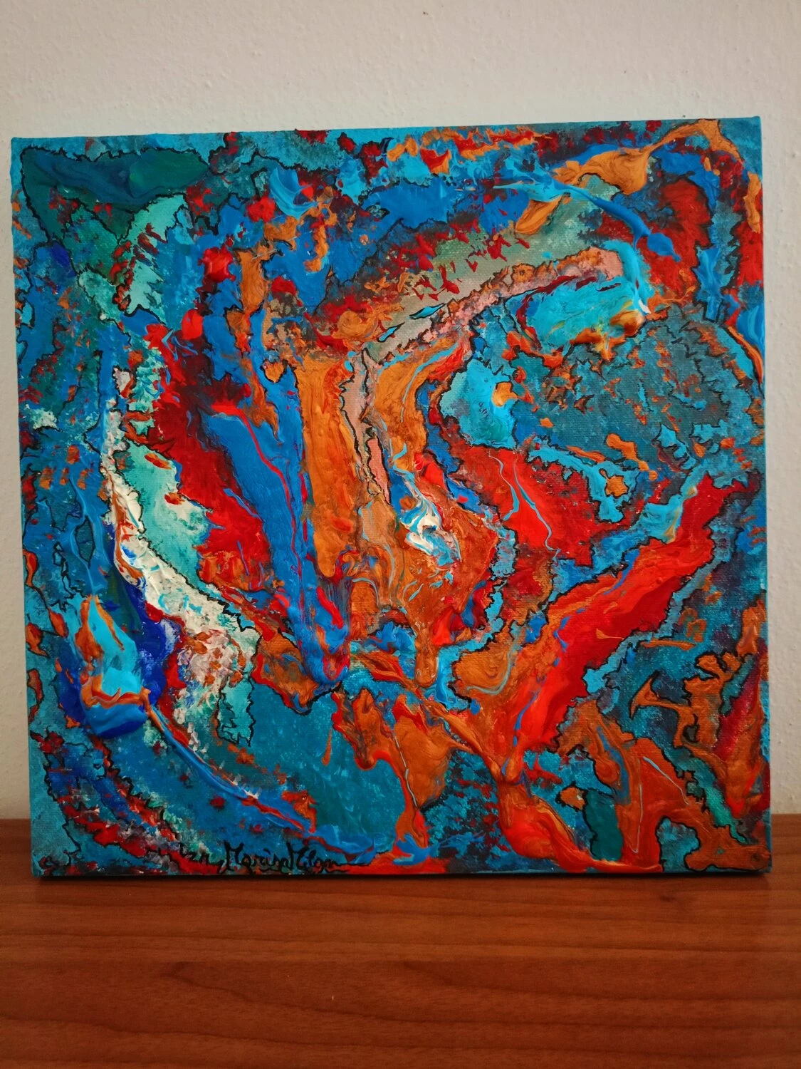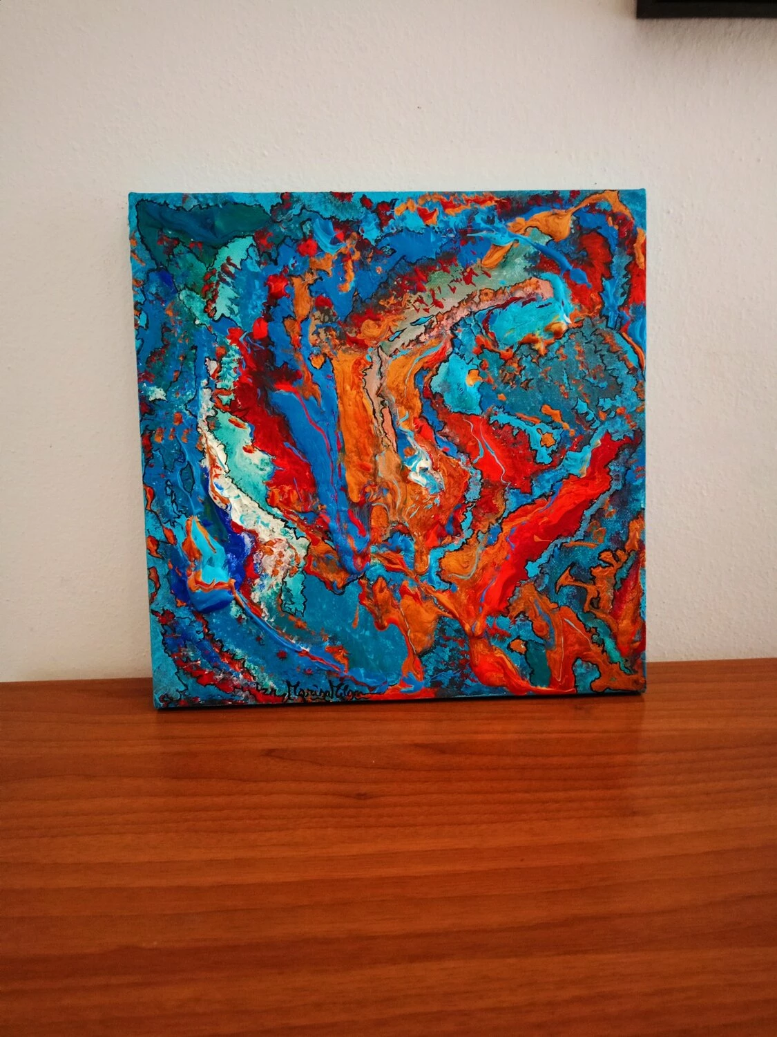 In quest’opera, ho voluto catturare l’impeto e la fluidità delle emozioni pure. L’uso vibrante di colori come il blu profondo e il rosso ardente rappresenta un viaggio attraverso le passioni infuocate e i profondi abissi della mente umana. Estruso in acrilico con tocchi di inchiostro d’India, questa tela parla di trasformazione e di scoperte interiori che invitano alla riflessione. Portando questa opera nella tua casa, aggiungerai non solo un tocco di colore, ma anche un flusso continuo di ispirazione e energia.