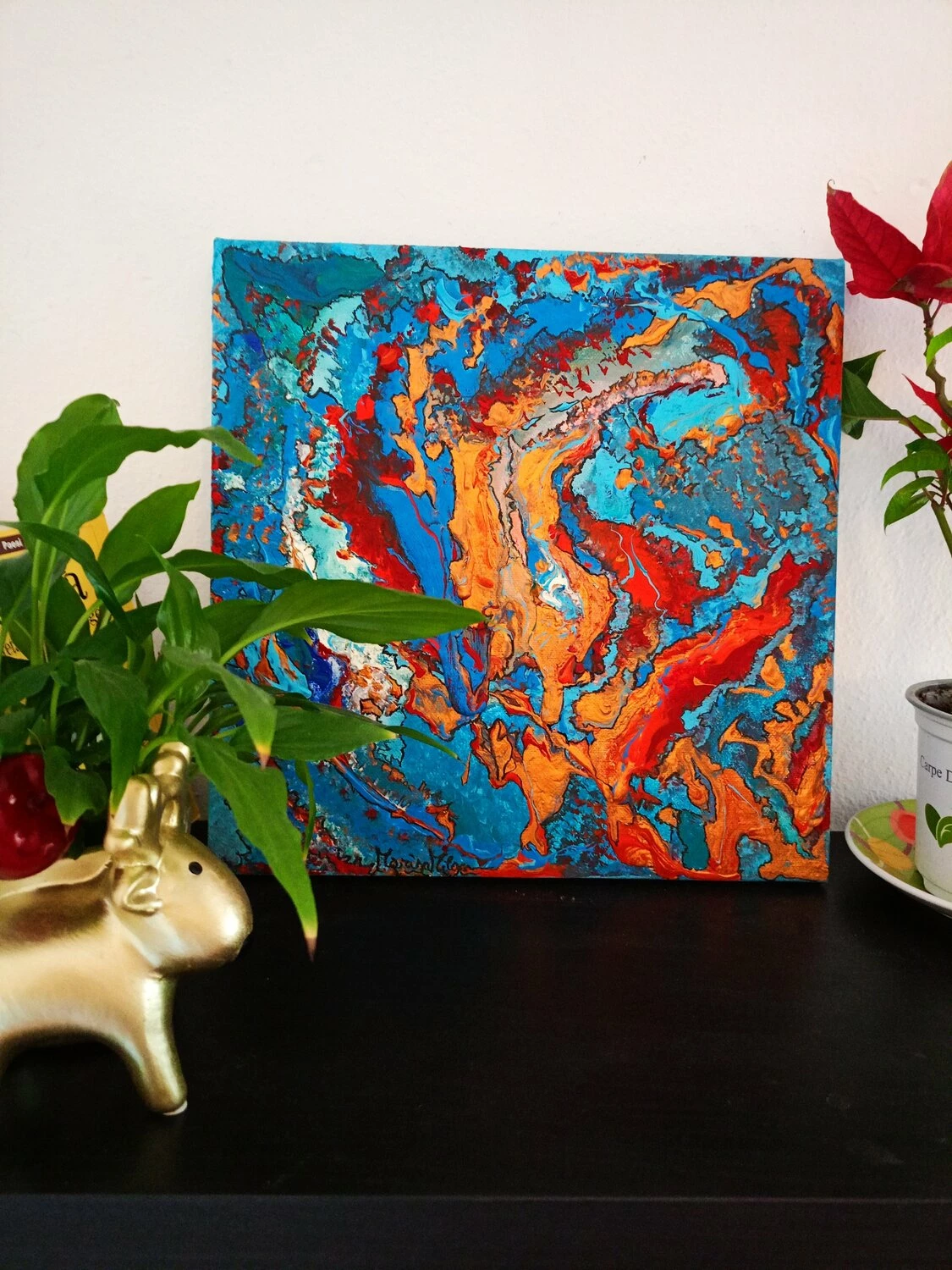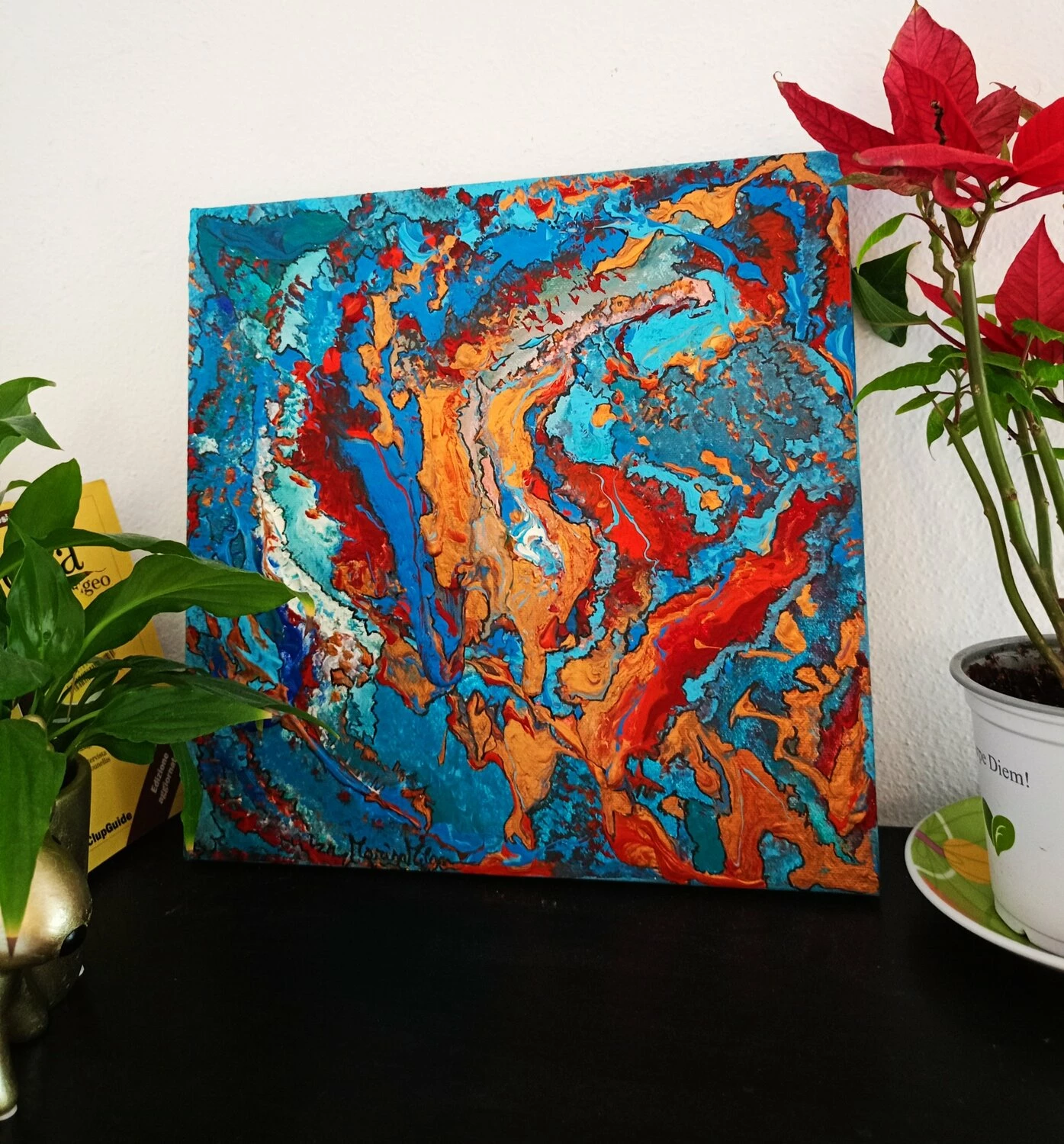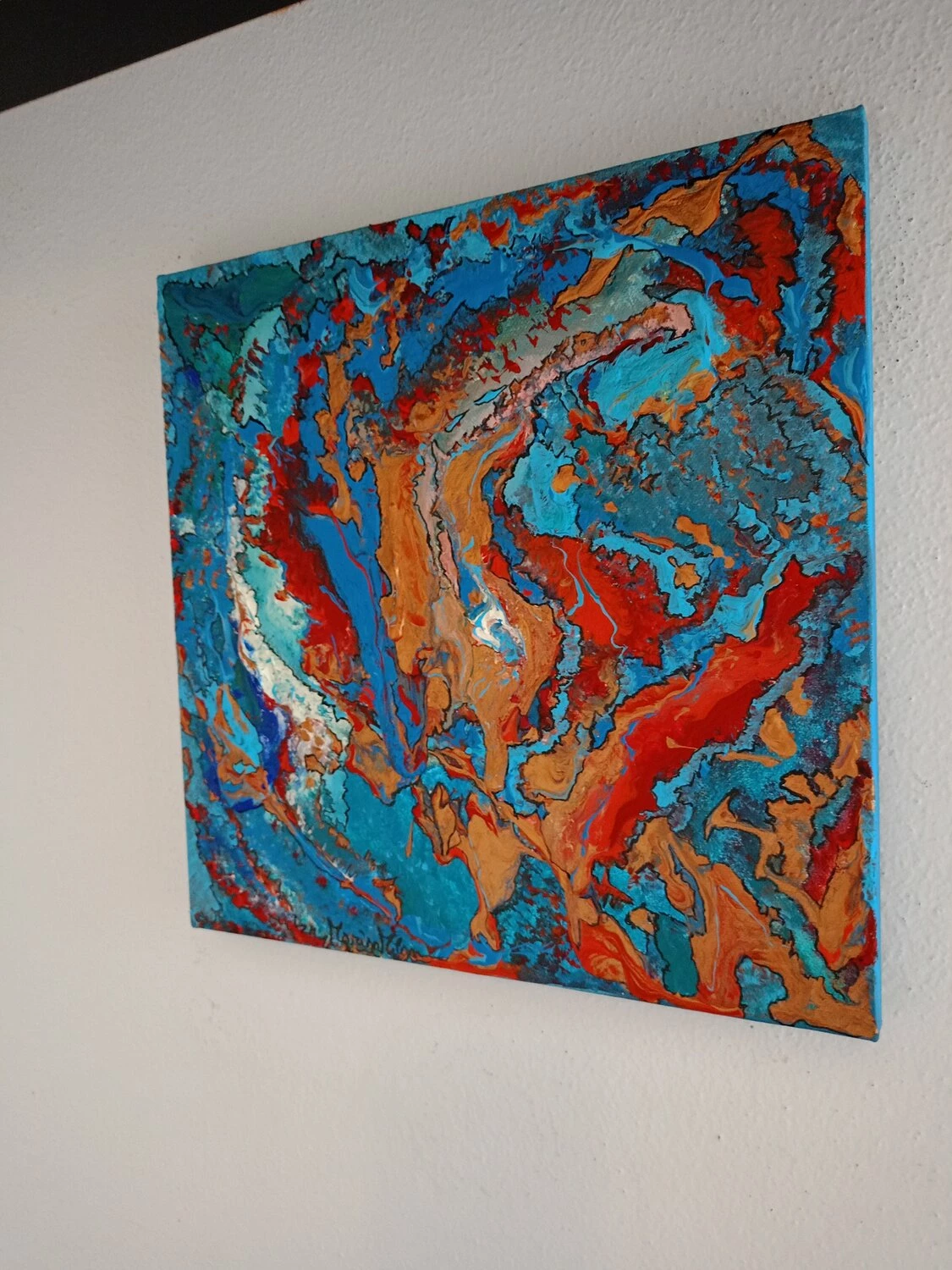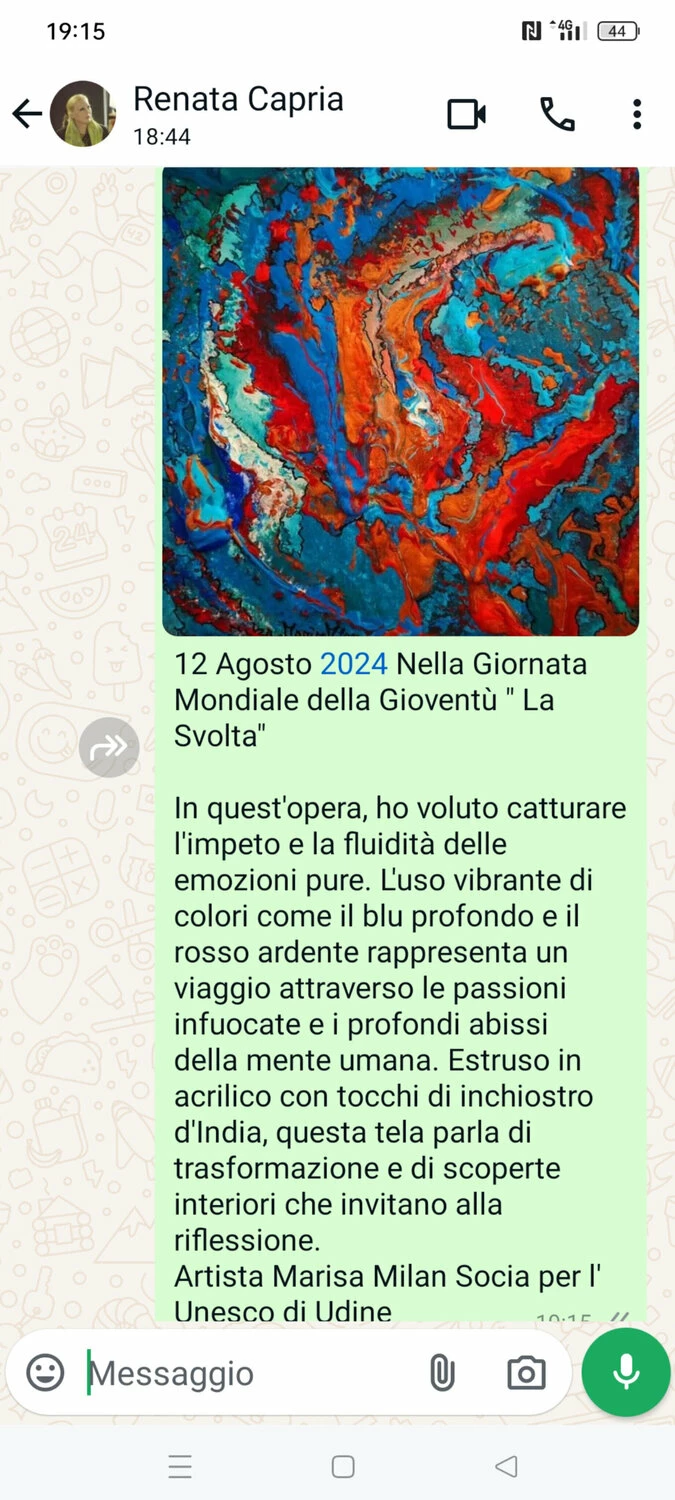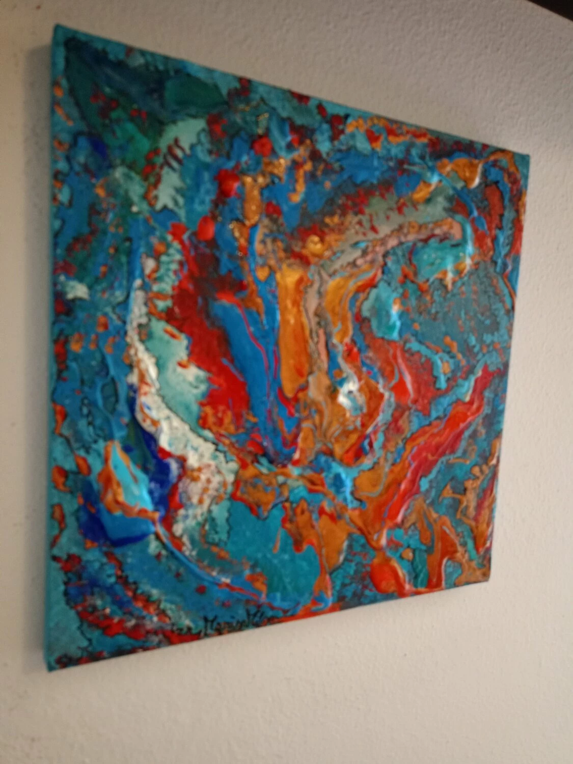 In quest’opera, ho voluto catturare l’impeto e la fluidità delle emozioni pure. L’uso vibrante di colori come il blu profondo e il rosso ardente rappresenta un viaggio attraverso le passioni infuocate e i profondi abissi della mente umana. Estruso in acrilico con tocchi di inchiostro d’India, questa tela parla di trasformazione e di scoperte interiori che invitano alla riflessione. Portando questa opera nella tua casa, aggiungerai non solo un tocco di colore, ma anche un flusso continuo di ispirazione e energia.
