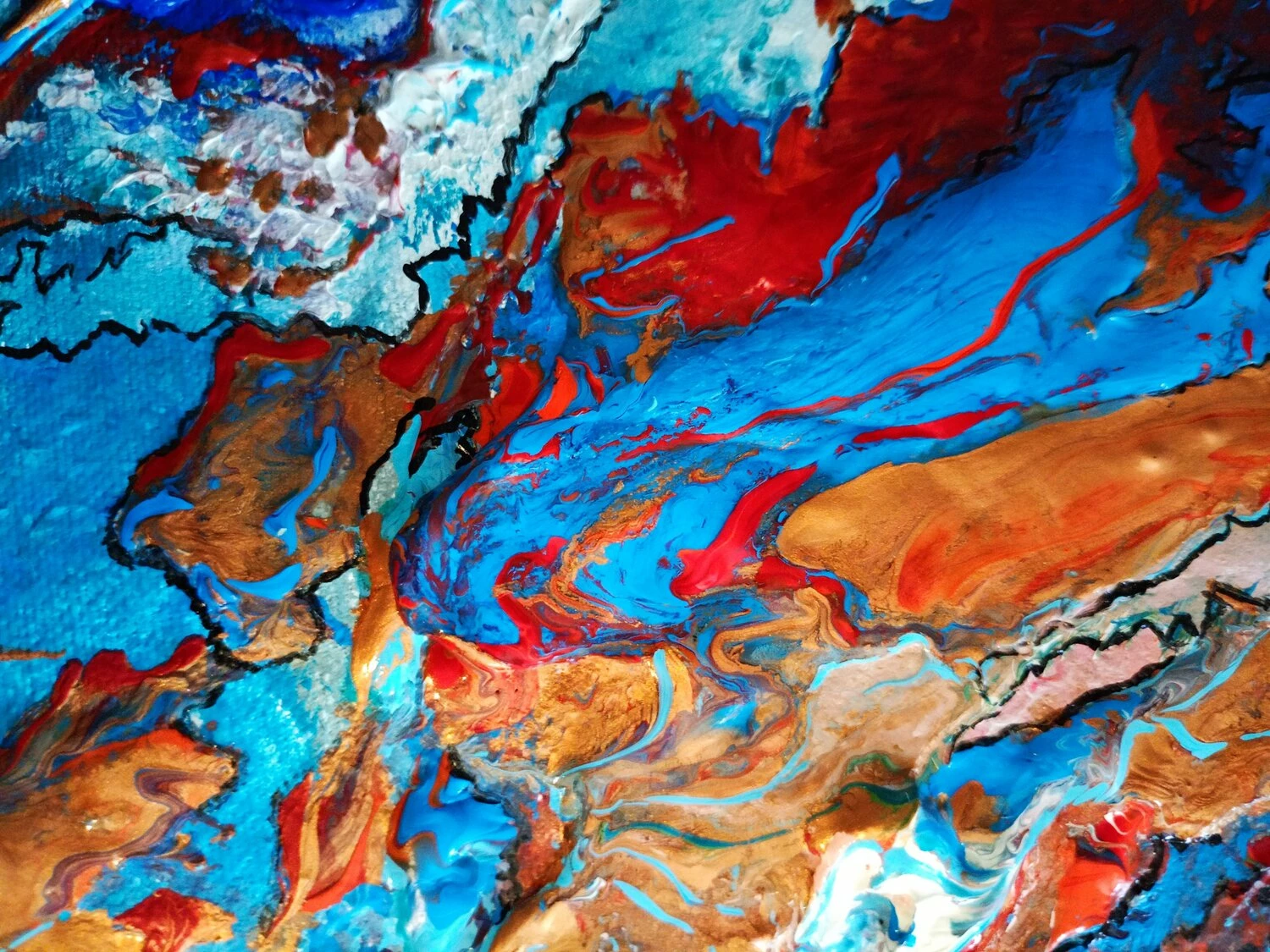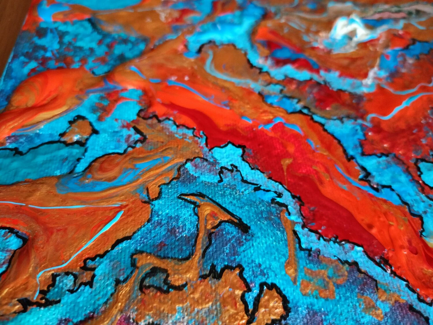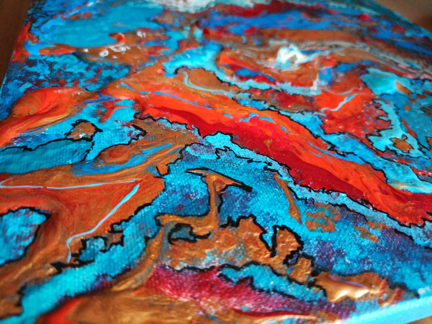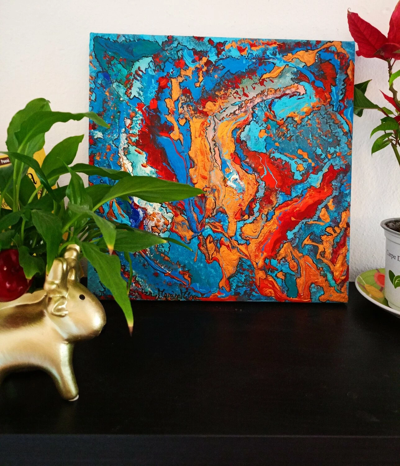 In quest’opera, ho voluto catturare l’impeto e la fluidità delle emozioni pure. L’uso vibrante di colori come il blu profondo e il rosso ardente rappresenta un viaggio attraverso le passioni infuocate e i profondi abissi della mente umana. Estruso in acrilico con tocchi di inchiostro d’India, questa tela parla di trasformazione e di scoperte interiori che invitano alla riflessione. Portando questa opera nella tua casa, aggiungerai non solo un tocco di colore, ma anche un flusso continuo di ispirazione e energia.